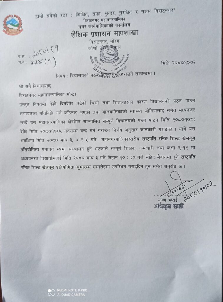 विराटनगर । शीतलहरूसँगै अत्यधिक चिसो बढेपछि विराटनगर महानगरपालिकाले महानगर क्षेत्रभित्र सञ्चालित शैक्षिक संस्था बिदा दिने निर्णय गरेको छ ।