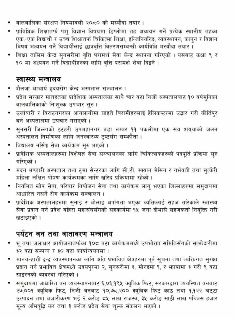 कोशी प्रदेशका मुख्यमन्त्री केदार कार्कीले आफनो नेतृत्वमा सरकार गठन भएको एक सय दिनमा गरेका कामहरुको उपलव्धि सोमवार सार्वजनिक गर्नु भएको छ । मुख्यमन्त्री तथा मन्त्रिपरिषदको कार्यालय विराटनगरमा आयोजित पत्रकार सम्मेलनमा उहाँले गत असोज २७ गते गठित सरकारले विराटनगरमा शैलजा आचार्य हृदय रोग केन्द्र संचालनमा ल्याउनुका साथै सुनसरीको इटहरी उपमहानगरपालिकामा –११ मा एक सय शैय्याको जलन अस्पताल निर्माणका लागि जनस्वास्थ्य सरोकार ट्रष्टसँग सम्झौता गरेको जानकारी दिनु भयो । मुख्यमन्त्री कार्कीले यस्तै अन्य कार्यहरुमा १० वर्ष मुनिका बालबालिकालाई सरकार मातहतका प्रादेशिक अस्पतालका साथै चार बटा निजी अस्पतालवाट आगामी १५ गतेदेखि निःशुल्क उपचारका लागि सम्झौता,संघीय सरकारबाट आगामी १५ दिन भित्र प्रहरी समायोजना गर्ने घोषणा भएर प्रक्रिया अघि वढाइएको, प्रदेशको पुनः नामकरण गर्ने आन्दोलन पहिचान पक्षधरसंग समस्या समाधानका लागि वार्ता समिति गठन, अनुशासित चालक, सुरक्षित सडक अभियान प्रदेशका सबै स्थानमा शुरुवात गरेको बताउनु भयो । उहाँले प्रदेश सभा खारेजको माग गर्दै आएका राष्ट्रिय प्रजातन्त्र पार्टीका प्रदेश सांसद अम्बरहादुर विष्टलाई सर्वसम्मत रुपमा सभामुखमा निर्वाचित गराएर प्रदेश सभा सबैको भावना समेट्न नेतृत्व प्रदान गरेको,प्रदेशमा उद्योग, व्यापारको दर्ता र नवीकरण सेवा अनलाइनबाट शुरु गरेको ,मोरङको लेटाङ– बुधवारे २९ दशमलव ६० किलोमिटर रणनीतिक महत्वको सडक शिलान्यास गरी निर्माण कार्य शुरु गरेको बताउनु भयो । मुख्यमन्त्री कार्कीले अन्य उपलव्धिहरुमा कर्णाली प्रदेश सरकारलाई भुकम्प पीडितका लागि रु एक करोड र राहत सामाग्री हस्तान्तरण, खानेपानी सिंचाई तथा उर्जा मन्त्रालयद्वारा मोरङको विराटनगर, सुनसरीको इटहरी र झापाको सुरङ्गा बजारमा तीन बटा विद्युतीय चार्जिङ स्टेशन संचालन र रोजगार प्रवद्र्धनका लागि वेव पोर्टल सञ्चालनमा ल्याएको जानकारी दिनु भयो । यसैगरी प्रदेश सांसदहरुलाई सांसदको हैसियत प्रदान गर्न र प्रदेशको गरिमा वढाउन स्थानीय तहको अधिकार सुरक्षित गर्दै रु २५ लाख भन्दा वढीको मात्र योजना प्रतिस्थापन विधेयकमार्फत ल्याइएको छ । वागमती, लुम्विनी, गण्डकी, कर्णाली प्रदेश र संघीय सरकारले पनि आगामी आर्थिक बर्षबाट करोड भन्दा माथिको मात्र योजना ल्याउने तयारी जुटेको उहाँले बताउनुभयो । सो अवसरमा प्रदेशका मन्त्रीहरु, विभिन्न मन्त्रालयका सचिवहरु, प्रदेश सरकार अन्तर्गत कार्यालयका प्रमुखहरुको उपस्थिति रहेको थियो ।