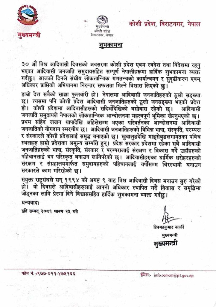 दिवसले संघीय लोकतान्त्रिक गणतन्त्रको कार्यान्वयन र सुदृढीकरण तथा अधिकार प्राप्तिको अभियानमा निरन्तर सफलता मिल्ने विश्वास लिएको मुख्यमन्त्री कार्कीद्धारा जारी शुभकामना सन्देशमा उल्लेख छ । कोशी प्रदेश आदिवासी जनजातिहरूको ठूलो जनसंख्या भएको प्रदेश भएको चर्चा गर्दै मुख्यमन्त्री कार्कीले आदिवासी जनजातिहरूको विभिन्न भाषा, संस्कृति, परम्परा र संस्कारले कोशी प्रदेशलाई समृद्ध बनाएको बताउनुभयो ।
