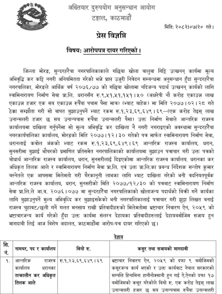मोरङको सुन्दरहरैँचा नगरपालिकाले गछिया खोलामा नदीजन्य पदार्थ उत्खनन्का लागि स्वामिनारायण निर्माण सेवा प्रालि, धरानसँग ९ करोड ५१ लाख ५१ हजार ५१ (भ्याटबाहेक) मा ठेक्का सम्झौता गरेकोमा । कम्पनीले १ करोड २३ लाख ६९ हजार ६४९ भ्याट आन्तरिक राजस्व कार्यालयमा दाखिला गर्नुपर्नेमा अधिकृत र ठेकेदारसँग मिलेमतोमा उक्त रकम अनियमितता गरेको अख्तियारको भनाइ छ ।