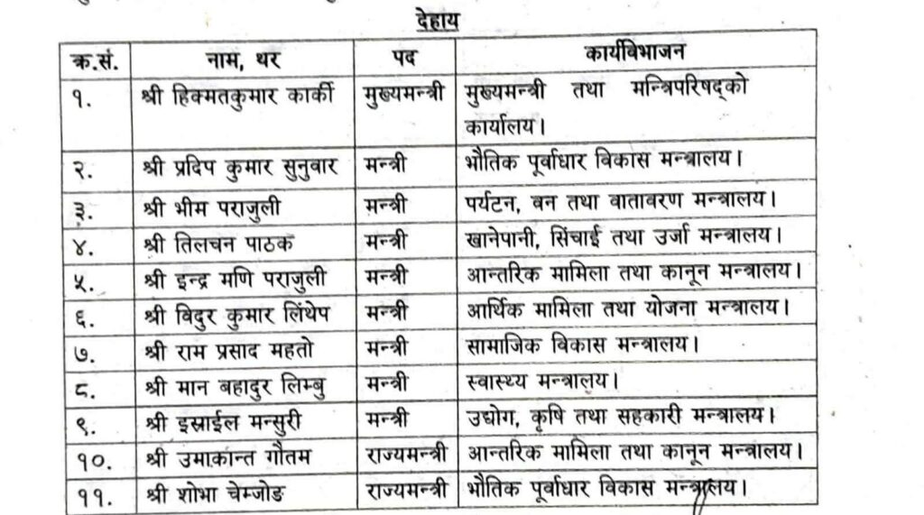मुख्यमन्त्री कार्कीले नेपालको संविधानको धारा १६८ को उपधारा ९ वमोजिम मौजुदा मन्त्रिमण्डल पुर्न गठन एंव कार्य विभाजन गर्नु भएको हो ।